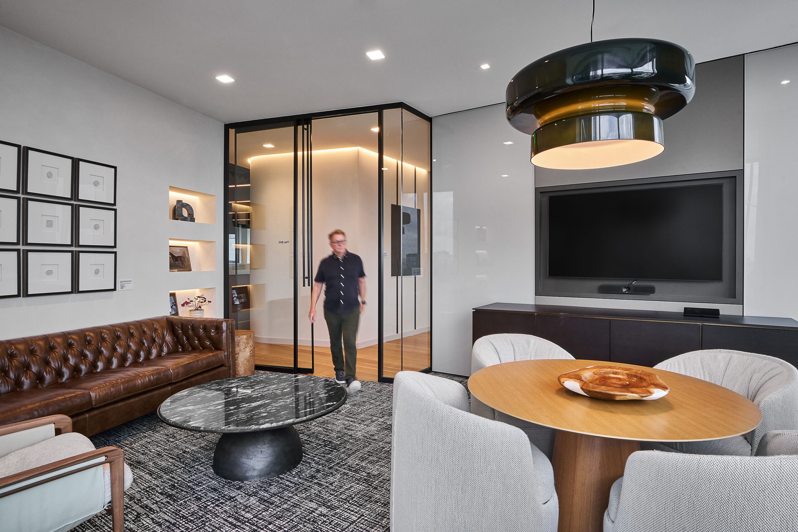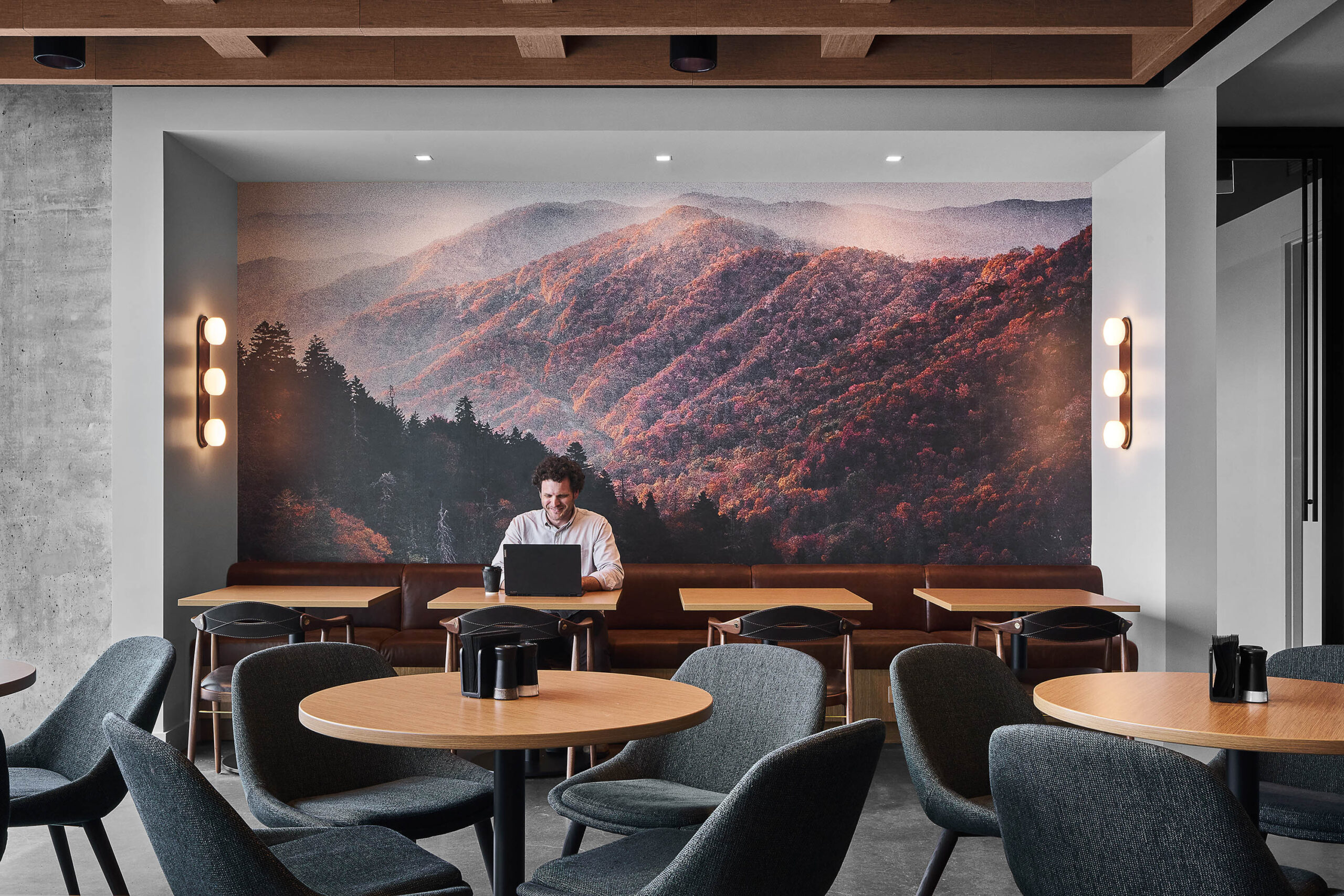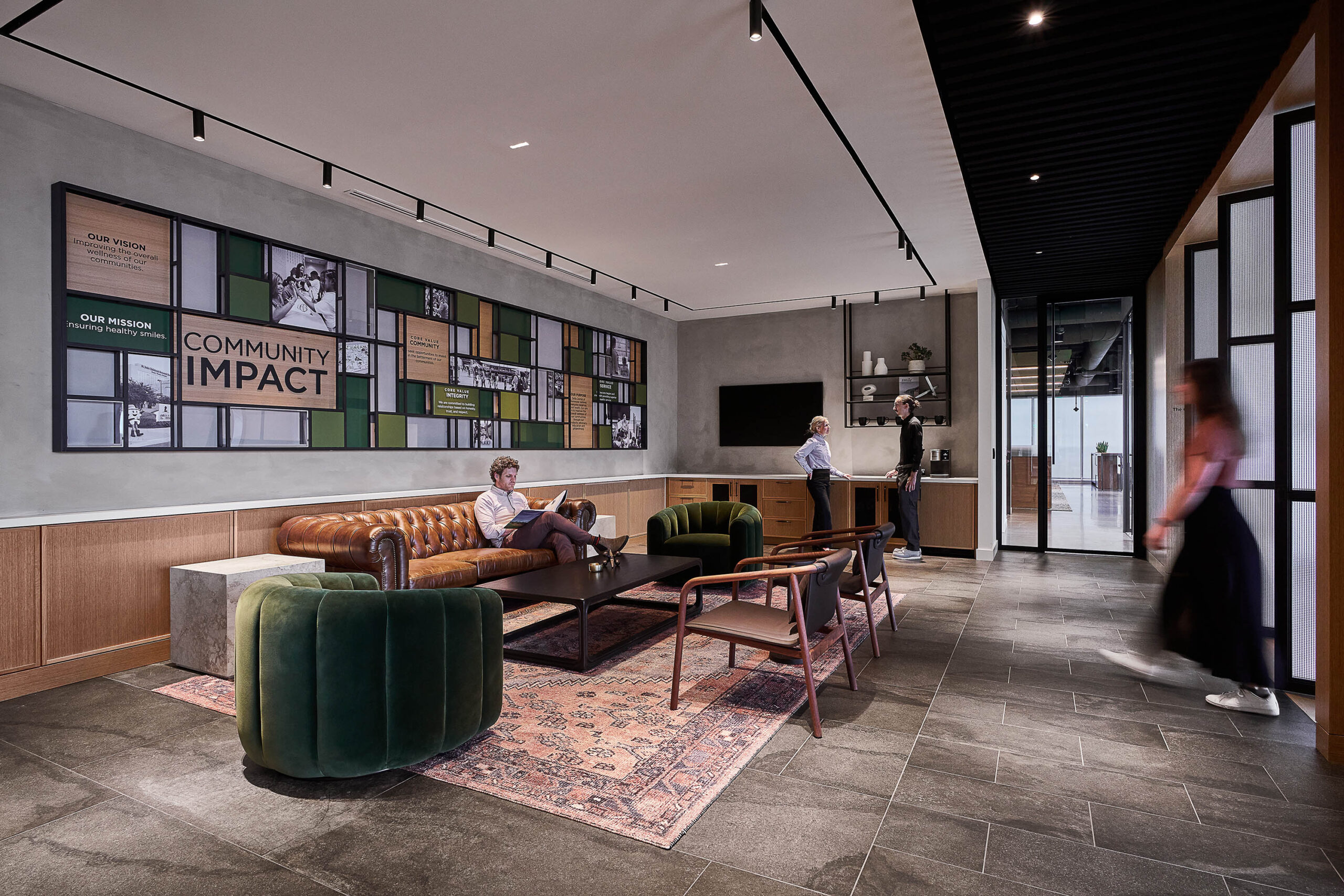 As the company aimed to transition workers back to the office after Covid and remote work policy changes, a fresh space was needed to breathe new life into their corporate culture. Creating an office that reflected an “employee-first” mindset was a primary objective. This was not to be just an ordinary office, but one where employees and guests would want to be and feel at home. Elevated, design-oriented interiors, comfortable, high-functioning furniture, and various hospitality-inspired amenities were incorporated. Even a game room immediately adjacent to the cafe features a golf simulator for both employee enjoyment and client entertaining.